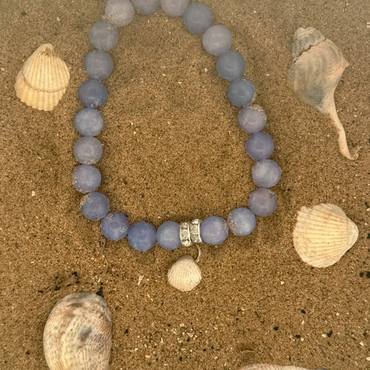 Aquamarine Beaded Bracelet - Sterling Silver Seashell Charm