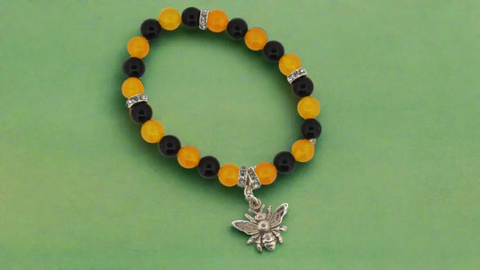 Honey Bee Beaded Bracelet - Yellow Agate & Black Obsidian Sterling Silver